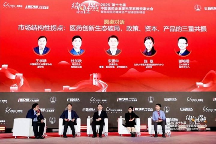在大会主论坛举办的“市场结构性拐点:医药创新生态破局,政策、资本、产品的三重共振”圆桌讨论中,中国医药企业管理协会副会长王学恭与悦康药业董事、副总经理、研究院院长宋更申;海正药业高级副总裁杜加秋;北京大学医药管理国际研究中心研究员陈敬;正心谷资本医疗合伙人谢榕刚围绕市场的结构性拐点展开对话。